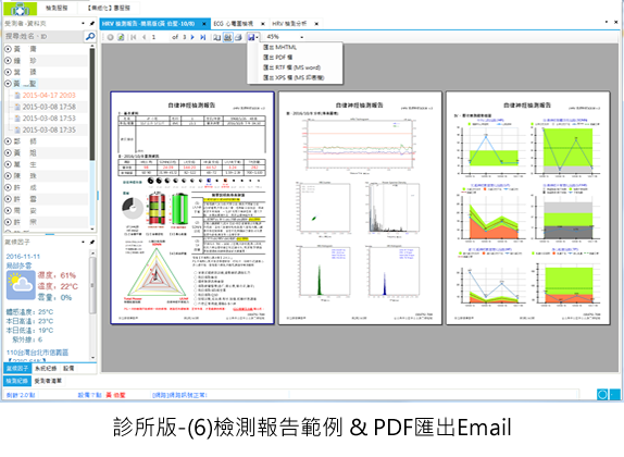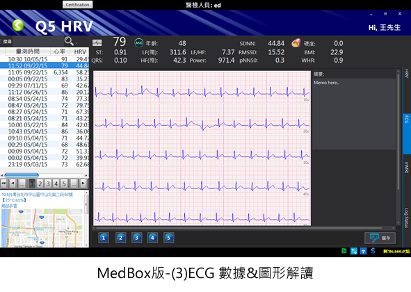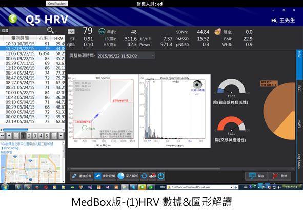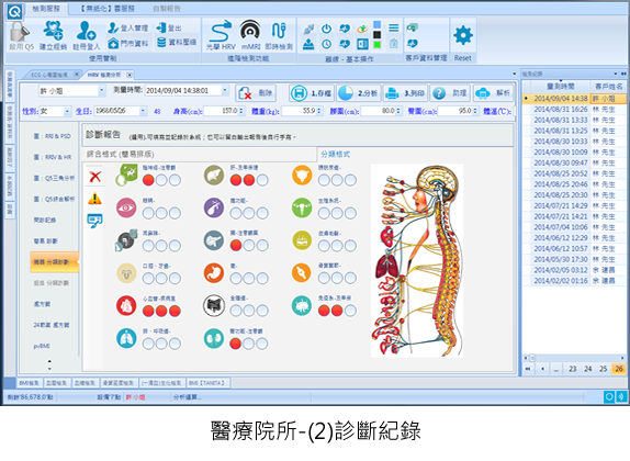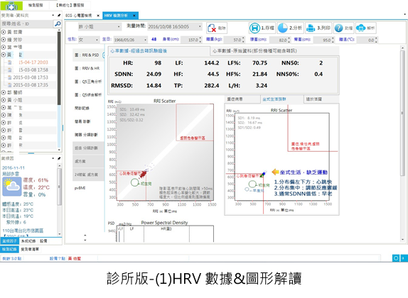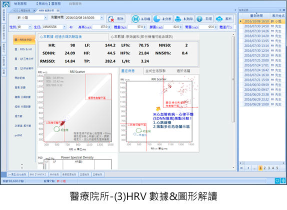 HRV monitor係採先進的生理分析與電腦分析技術,評估人體心電波型、 SDNN、 即時 HRV簡易頻譜、心跳等數值。將心電圖記錄後,會即時計算出心跳速率並進行心率變異性之分析, 計算出心跳標準差與平均值,並進行頻譜分析。記錄入記憶卡 Micro SD 的檔案名, 若無 Micro SD則不顯示