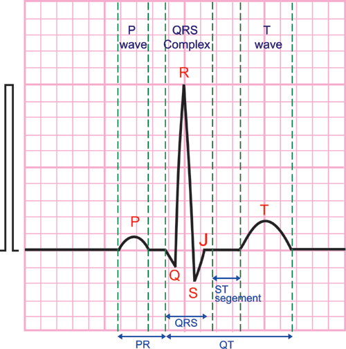 QRS 複合波:自Q波的起始自S波的結束,主要代表著心室的去極化,其範圍通常介於0.08秒-0.12秒,約2-3小格寬,如果超過這個範圍,通常表示有束枝傳導阻滯或WPW症候群發生的可能。