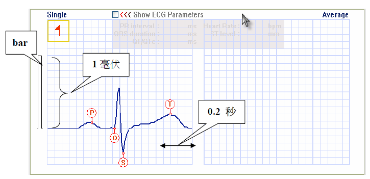 QT/QTc:QT/QTc的量測,是從Q的開始到T波的結束,其代表著左右心室去極化與再極化的時間,QT間期的長短與心跳速率成反比。藉由下列公式可進一步計算得QTc,一般QTc值約為0.41秒。